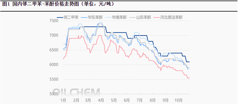 In October, the domestic phthalic anhydride market experienced a volatile decline, with prices hitting a new low for the year. The monthly average price of ortho-phthalic anhydride decreased by 3.18% month-on-month, while the monthly average price of naphthalene-based phthalic anhydride fell by 4.13%. The decline in domestic phthalic anhydride prices, which hit a new annual low, was primarily driven by cost-related factors. During the month, influenced by trade conflicts, pessimistic and wait-and-see sentiments dominated the market. Prices of bulk commodity futures dropped, and the decline in the prices of raw materials such as ortho-xylene and industrial naphthalene widened, leading to a collapse in cost support for the phthalic anhydride industry. As a result, domestic phthalic anhydride prices showed a gradual downward trend. However, amid sustained losses in the naphthalene-based phthalic anhydride sector, increased maintenance of production facilities led to tighter spot supply in some northern regions. Additionally, inventories in the ortho-phthalic anhydride sector remained relatively low, providing some support to the market. By late October, expectations of stabilizing ortho-xylene prices and a positive macroeconomic outlook stimulated the release of rigid demand. This improved low-price transactions in the domestic phthalic anhydride market, contributing to market stabilization